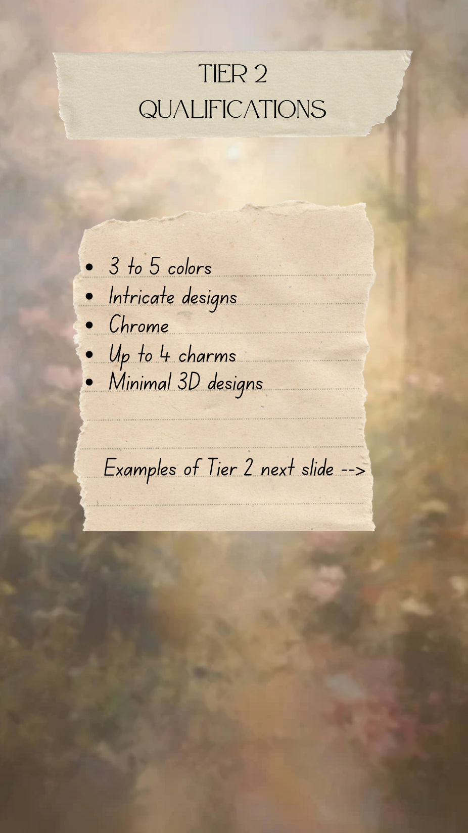 Tier 2: 3 to 5 colors. Intricate designs with chrome, up to 4 charms, minimal 3D designs. Please refer to photos above for examples.